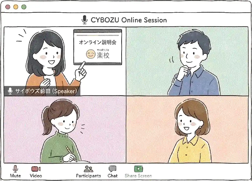 お子さまの学習状況や他の子どもたちとの関わり方を踏まえ、サイボウズの楽校での過ごし方や気になる点をご相談いただけるオンライン個別相談会です。