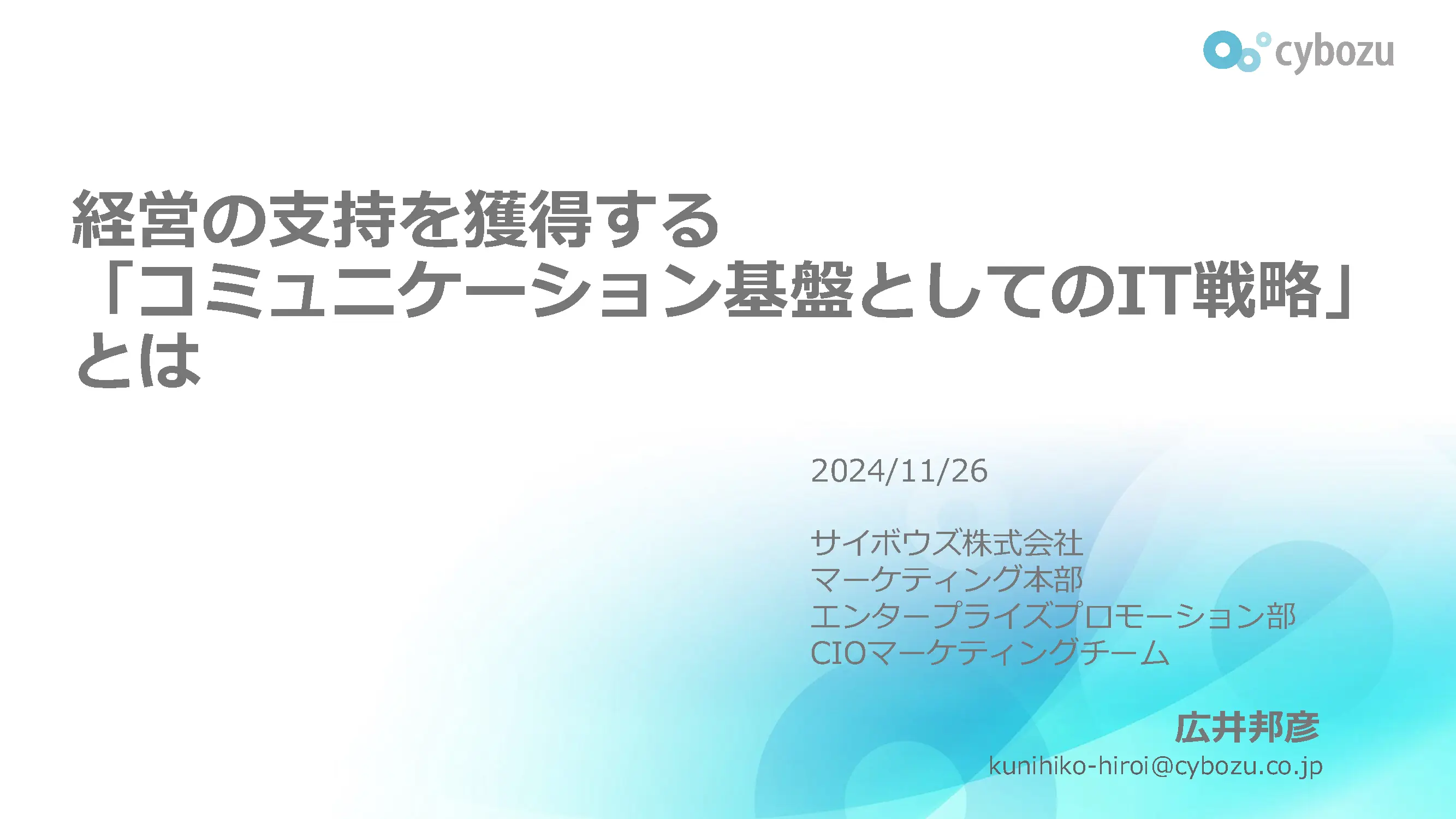 サイボウズのシニアコンサルタント広井邦彦が、2024年11月に開催されたITR主催「IT Trend 2024」に登壇しました。 本イベントは、AIを競争力の源泉とする“AIネイティブカンパニー”の重要性を軸に、戦略立案から業務遂行に至るまでの活用像を提示。 今回は、イベントに登壇したサイボウズ広井による講演「経営の支持を獲得する「コミュニケーション基盤としてのIT戦略」とは」を、イベントレポート形式でご紹介します。