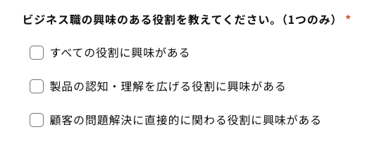 ビジネス職は営業職、マーケティング職、カスタマーサクセス職の3職種いずれかに配属となります。ビジネス職では、製品をお客様に認知や興味を持っていただくところから、試用、導入、定着拡大まで、それぞれの役割を持ったチームが部門を超えて連携し、お客様に価値を届けています。面接の際の参考のために興味のある役割について教えてください。