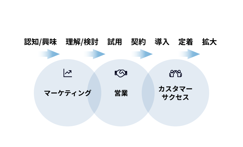 サイボウズの仕事には、製品・サービスをつくる、より多くのお客様に拡げる、継続的な製品活用を支える、という流れがあります。ビジネス職では、製品をお客様に認知や興味を持っていただくところから、試用、導入、定着拡大まで、それぞれの役割を持ったチームが部門を超えて連携し、お客様に価値を届けています。