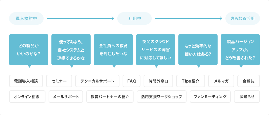 導入前と導入後では必要なサポートメニューが異なるため、お客様のご利用段階に沿ったサポートメニューをご用意しています。また、サポートの方法もWebサイト、メール、電話、対面などでご用意。少しでも気軽にお問合せいただけるよう日々検討、改善に努めています。